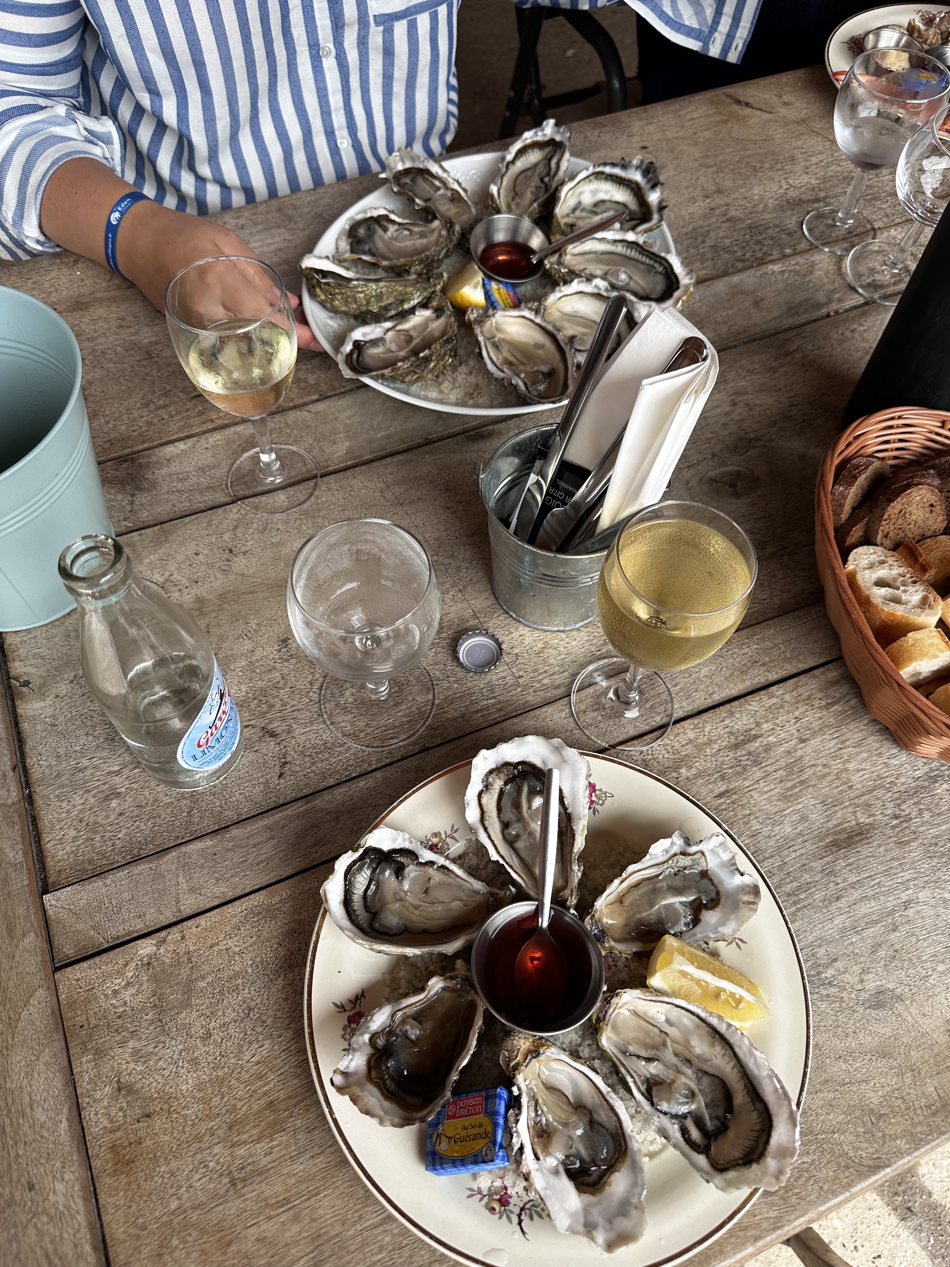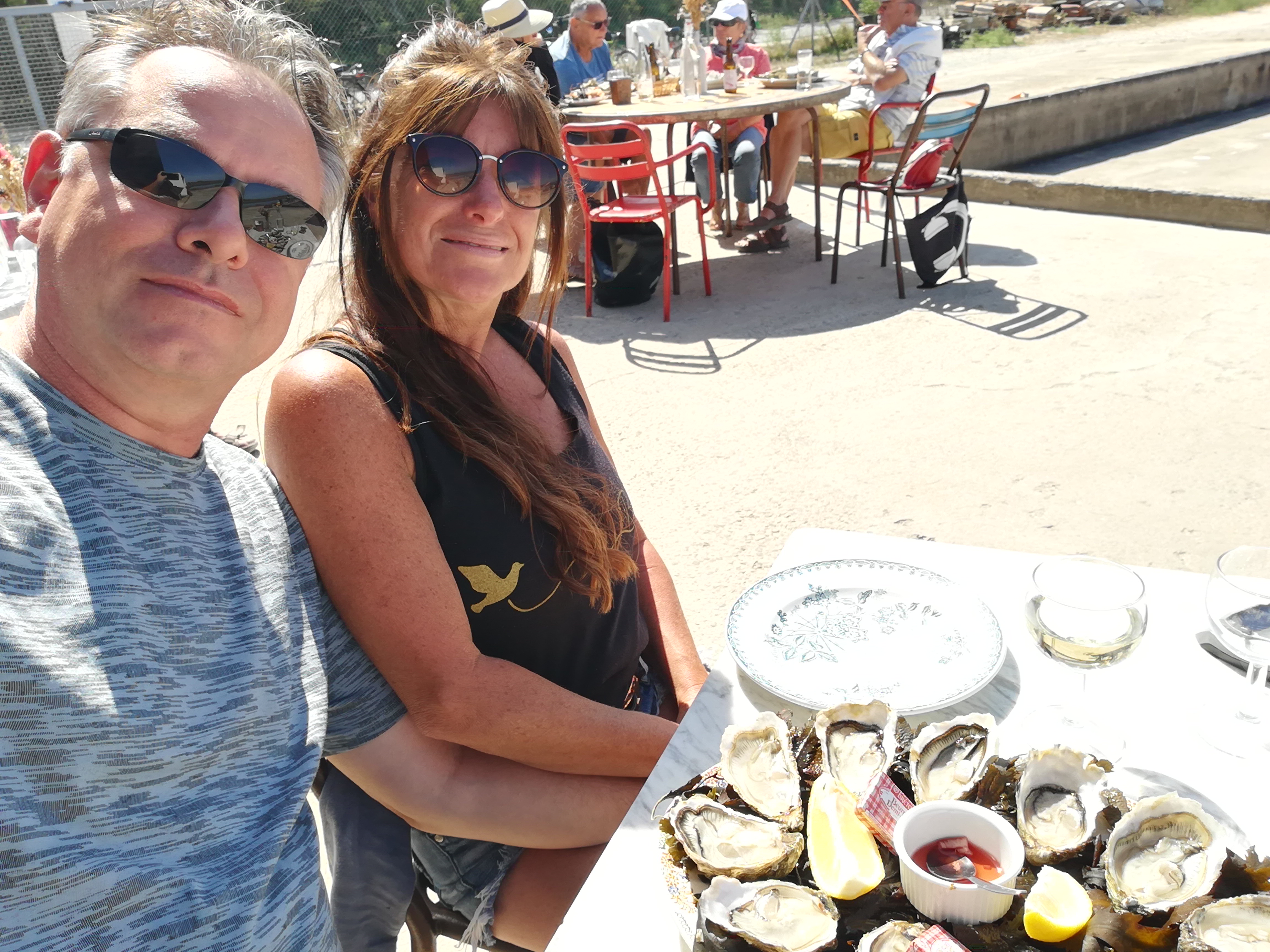 Arrêt après quelques kilomètres vélo. Des huîtres et crevettes avec vin blanc, un régale dans un endroit plein de charme et une serveuse très gentille.