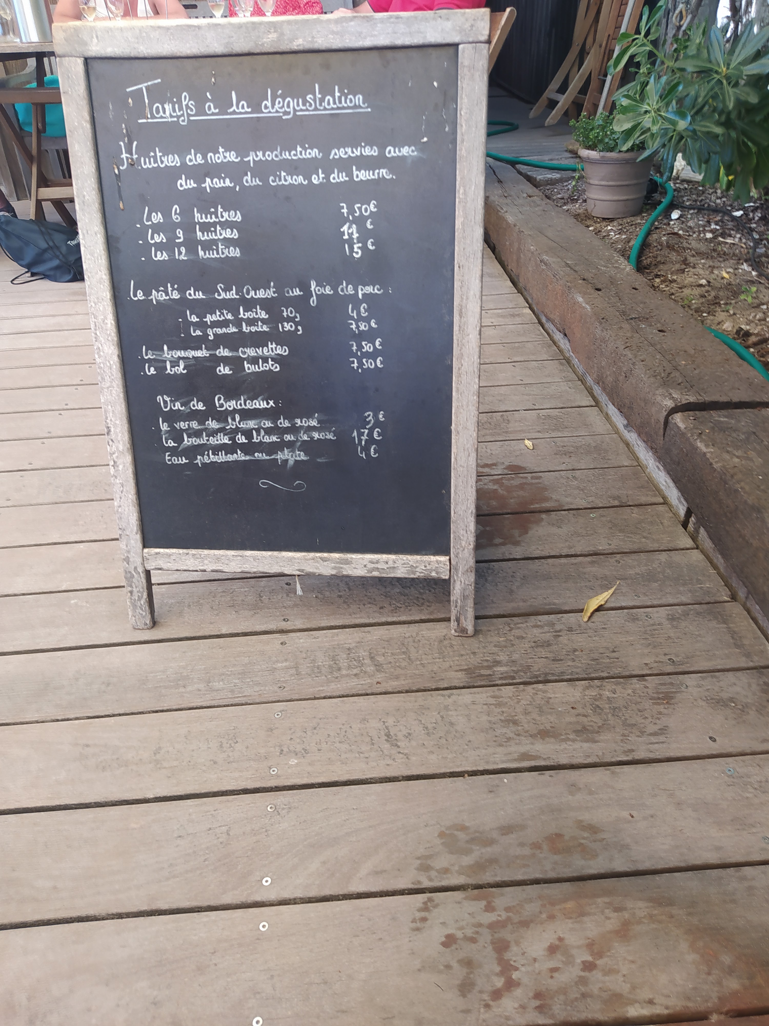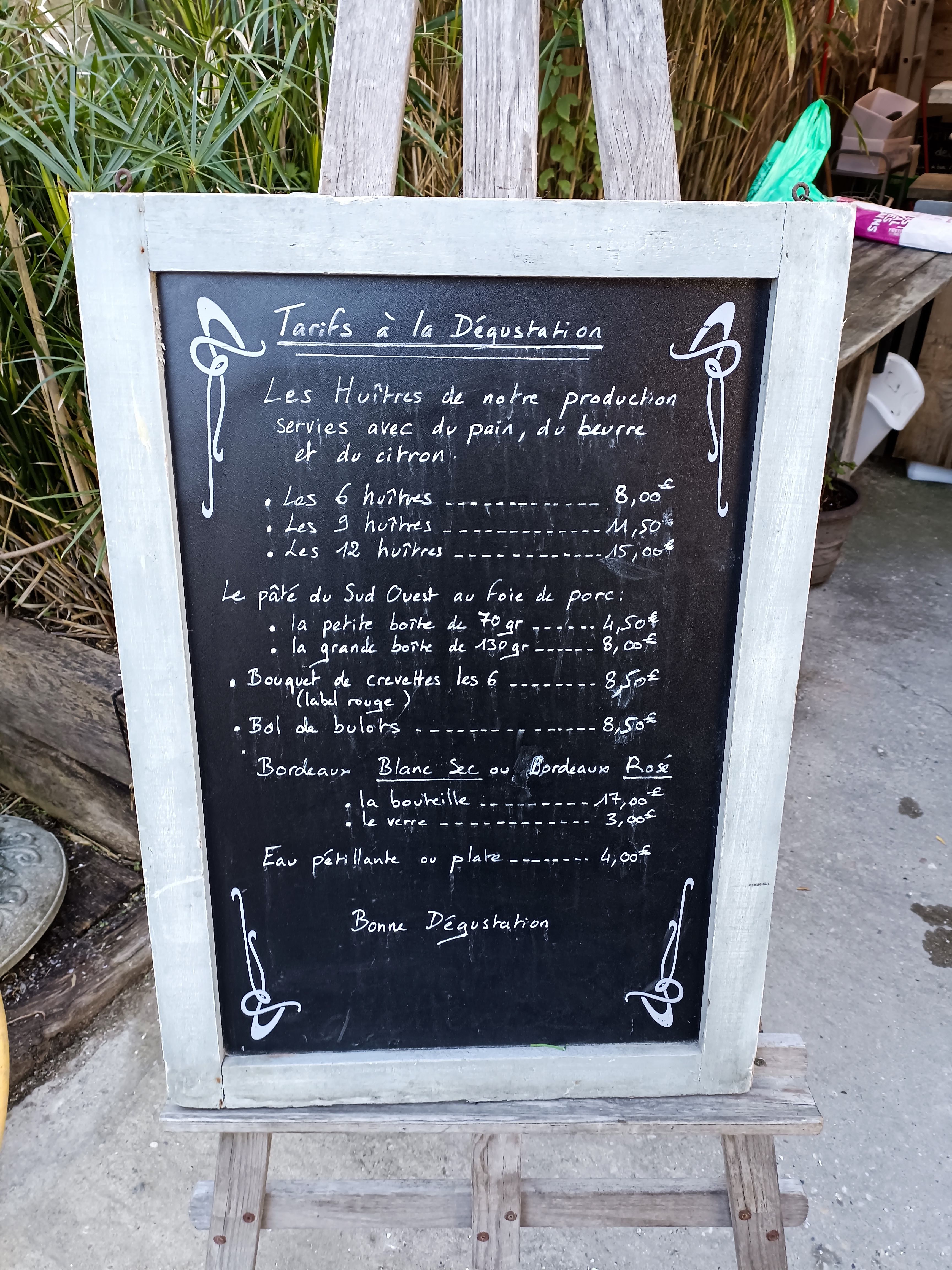 Quelle découverte! Des huîtres du producteur à l’assiette. Comment ne pas être conquis quand vous entendez « huîtres de notre production? » Nous avons tout goûté: huîtres (deux catégories, bassin et océaniques), bulots, crevettes, terrines, et le tout arrosé d’un délicieux vin blanc sec; tout est formidable. Il peut y avoir un peu d’attente à l’entrée l’adresse étant victime de son succès. Patientez donc! Cela vaut le coup. Le personnel est accueillant et d’emblée on nous a signalé que les huîtres étaient laiteuses, période de reproduction oblige.