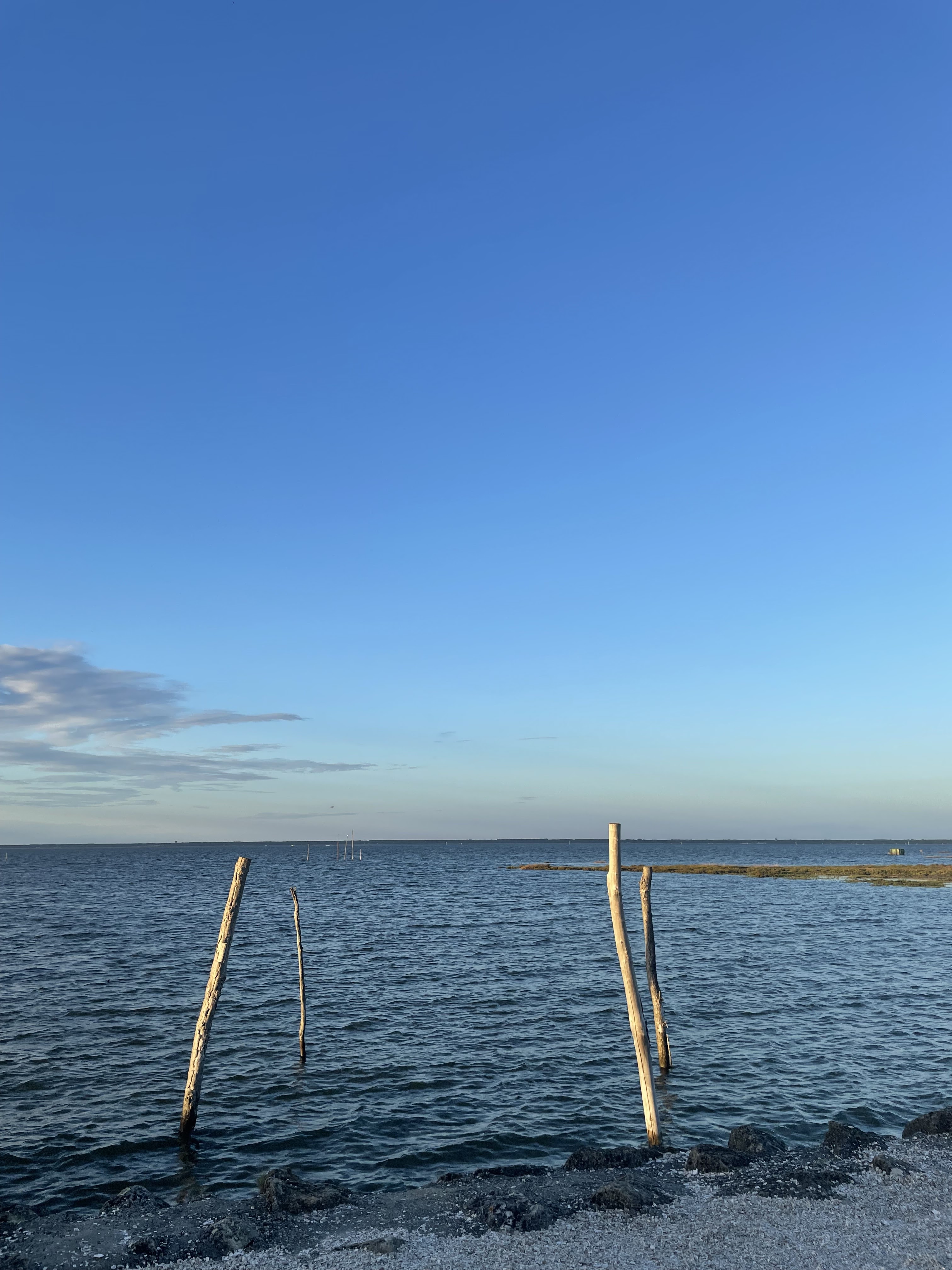A marée montante de la terrasse on peut voir les huitriers rentrer et penetrer l'estey avant daponter. Et sur l'estran des tonnes qui n'attendent que leurs chasseurs et les canards . Et quelle lumière ! Quand en plus dans votre assiette se disputent les huîtres de chez bidart, arrosées d'un petit verre d' Entre Deux Mers , on se prend prend rêver