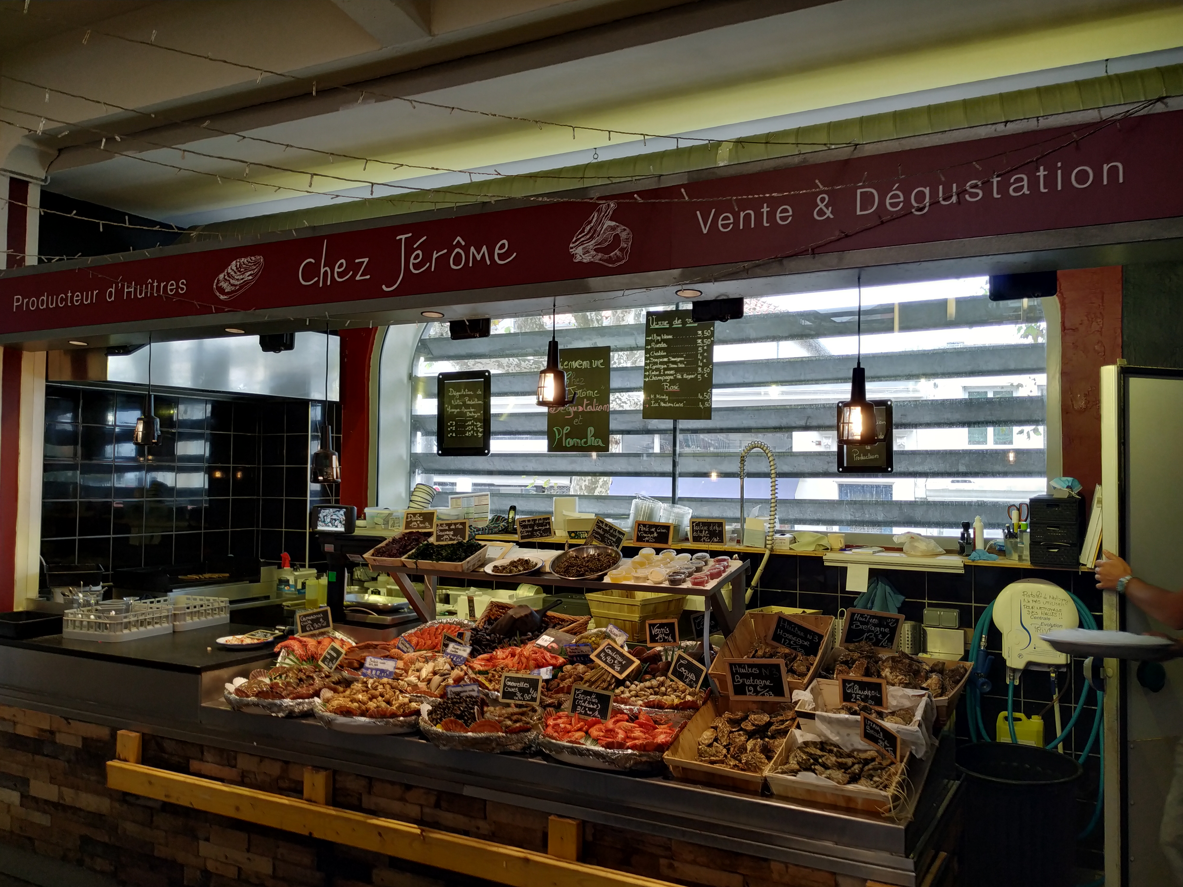 Nous sommes allés dans les halles de Biarritz pour goûter les huîtres pour la première fois et avons finalement atterri ici chez Chez Jérôme, car on pouvait ici se procurer 6 huîtres avec un verre de vin pour moins de 10€. Je dois admettre que ce n'est pas du tout mon plat préféré, mais c'était une expérience et l'ambiance et les vibrations des salles étaient assez étonnantes.