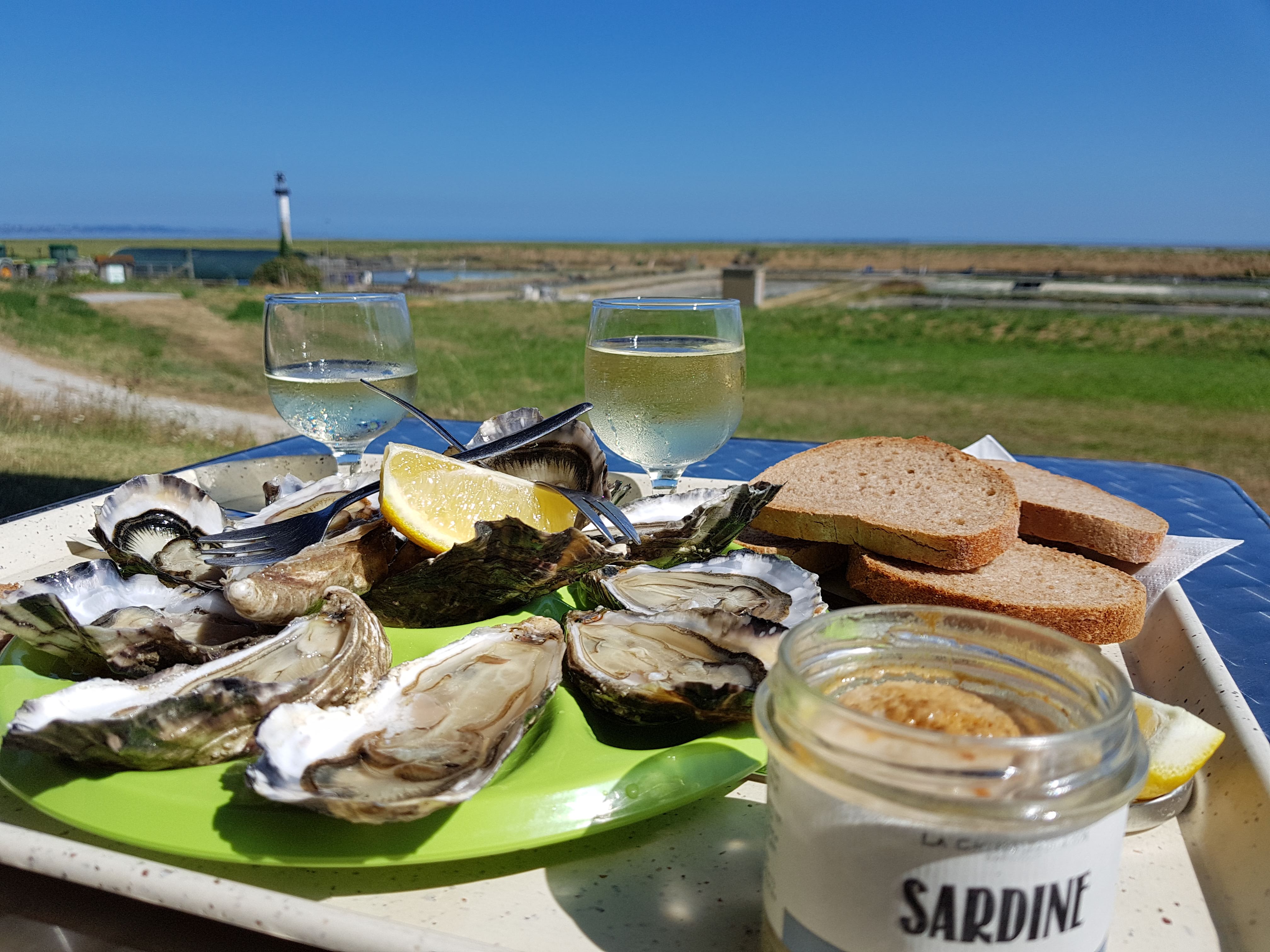 Une bonne douzaine d'huîtres avec un verre de vin blanc face à la baie, un régal à partager entre amis ou sans ami 😉😉