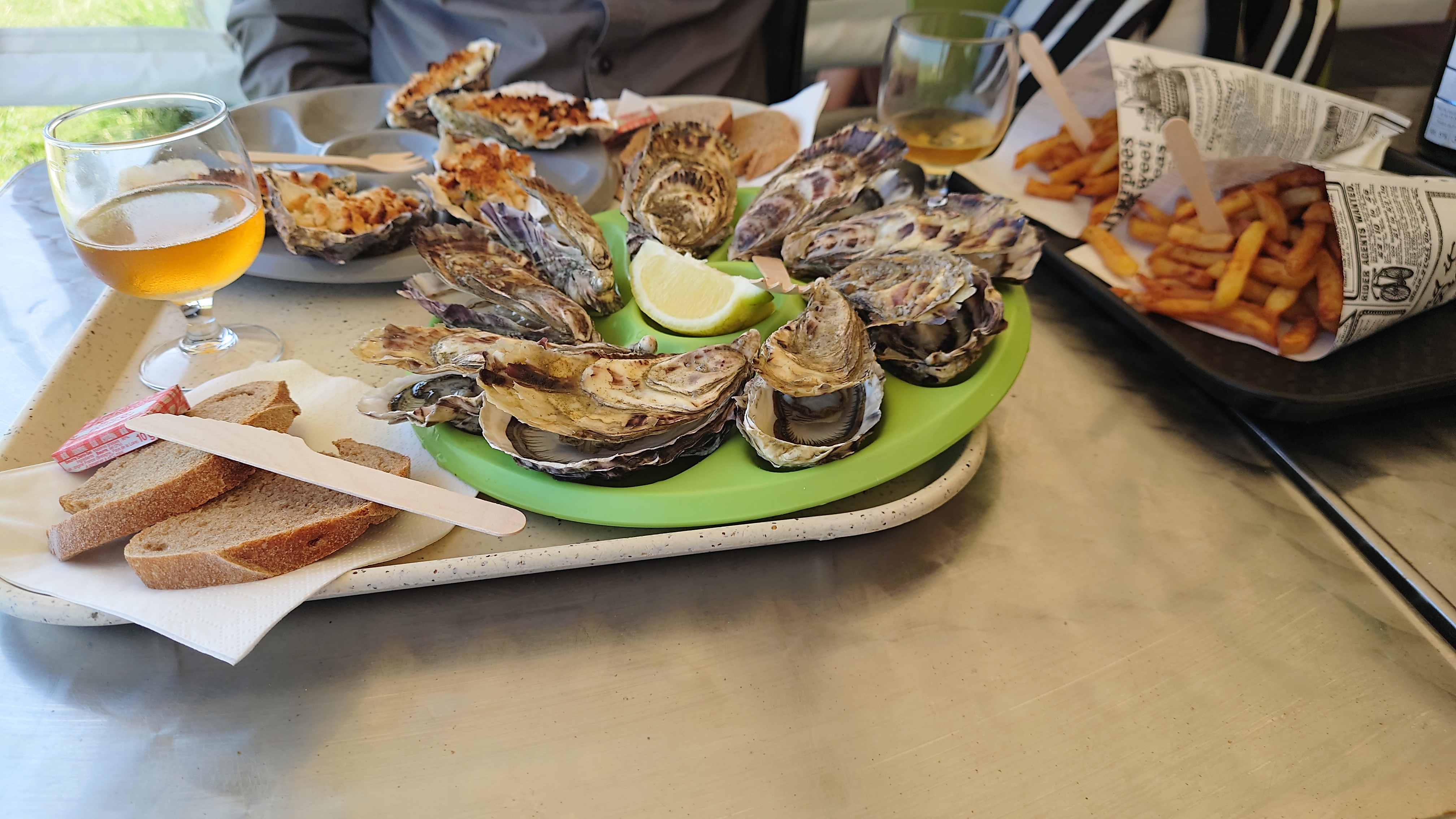 Moules et huitres extra fraiches et goutues, rien à redire pour nous. Bien installés en terrasse à l'arrière, nous avons pris une barquette de frite à 2,50 chez le stand voisin comme beaucoup, et le repas était parfait. Et serveuse très sympathique !