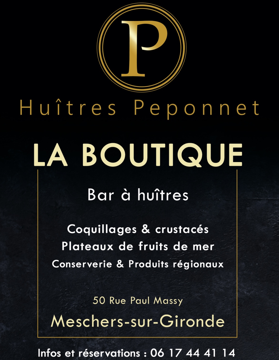 Voici toutes les informations sur le Bar-restaurant à huîtres Huîtres Peponnet qui ce trouve au 50 Rue Paul Massy, 17132 Meschers-sur-Gironde (17). Sur cette fiche vous trouverez les photos, l'adresse, les horaires d'ouverture, le numero de téléphone et les avis clients.Vous pouvez églement rédiger un avis si vous le souhaitez en bas de page.