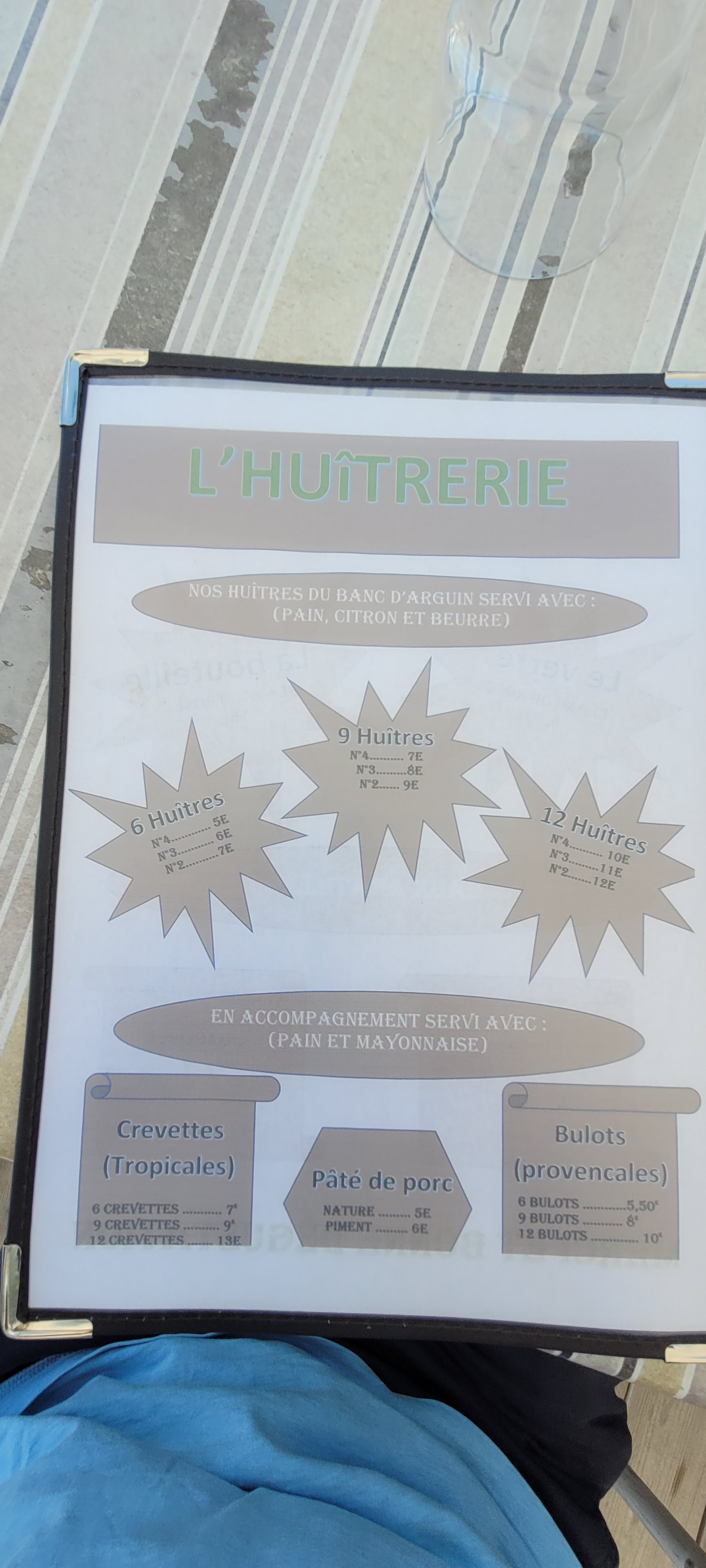 On arrive à 13h,,,peu de monde,,,on a l impression de déranger, enfin,on se redirige vers le comptoir,,,bon,et bien on ne sert plus car le cuisinier n est pas là...nous sommes le 24 juillet, plein cœur de la saison estivale,,impossible de concevoir cela, a fuir,,des ostréiculteurs qui veulent se remplir les poches avec les touristes et incapables de gérer leur établissement