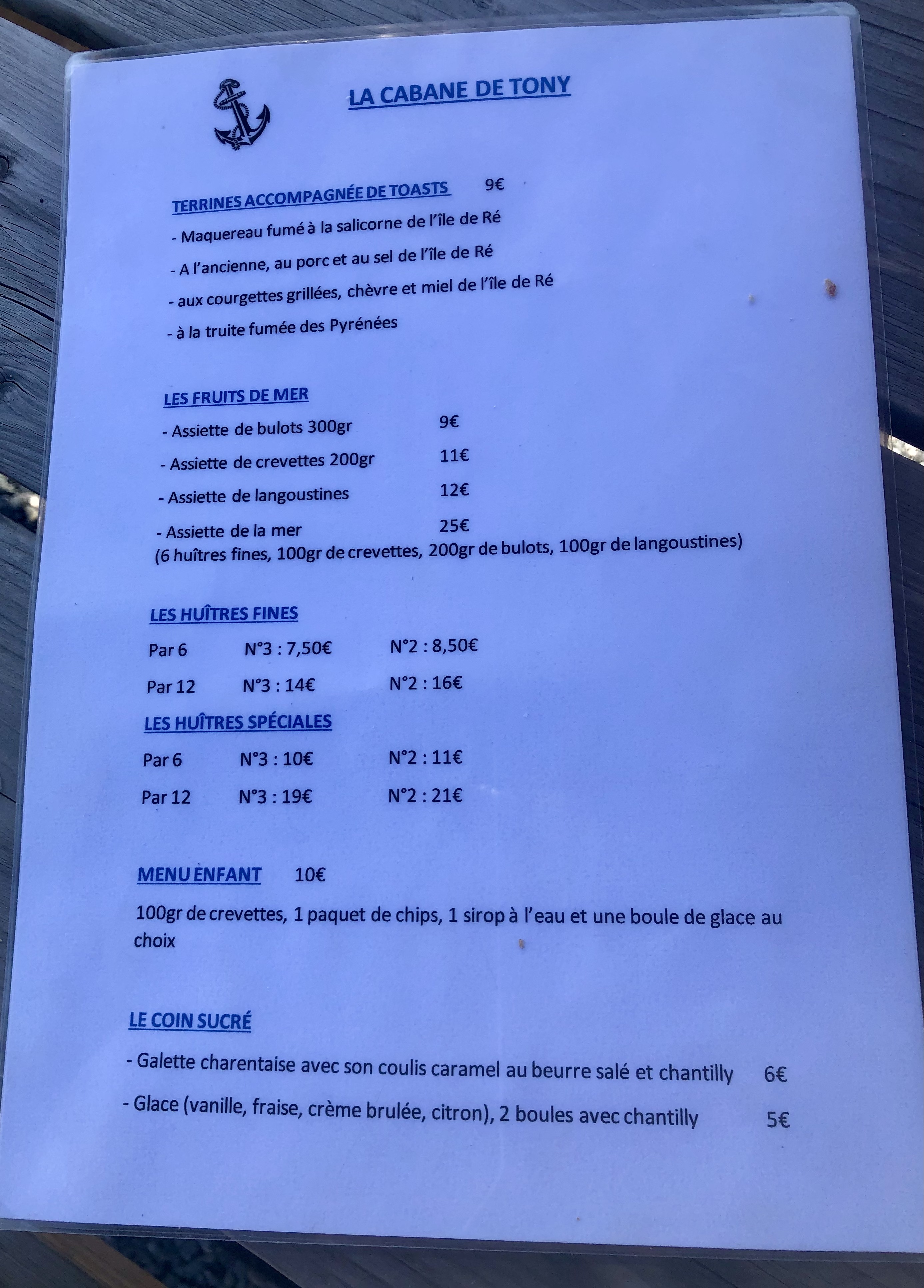 C'est toujours un plaisir de s'arrêter déguster les huîtres, crevettes, boulots... À la Cabane de Tony. Une cabane comme on les aime. C'est une adresse à ne surtout pas louper entre La Flotte et Saint Martin. Nous nous y arrêtons à chaque passage sur île.