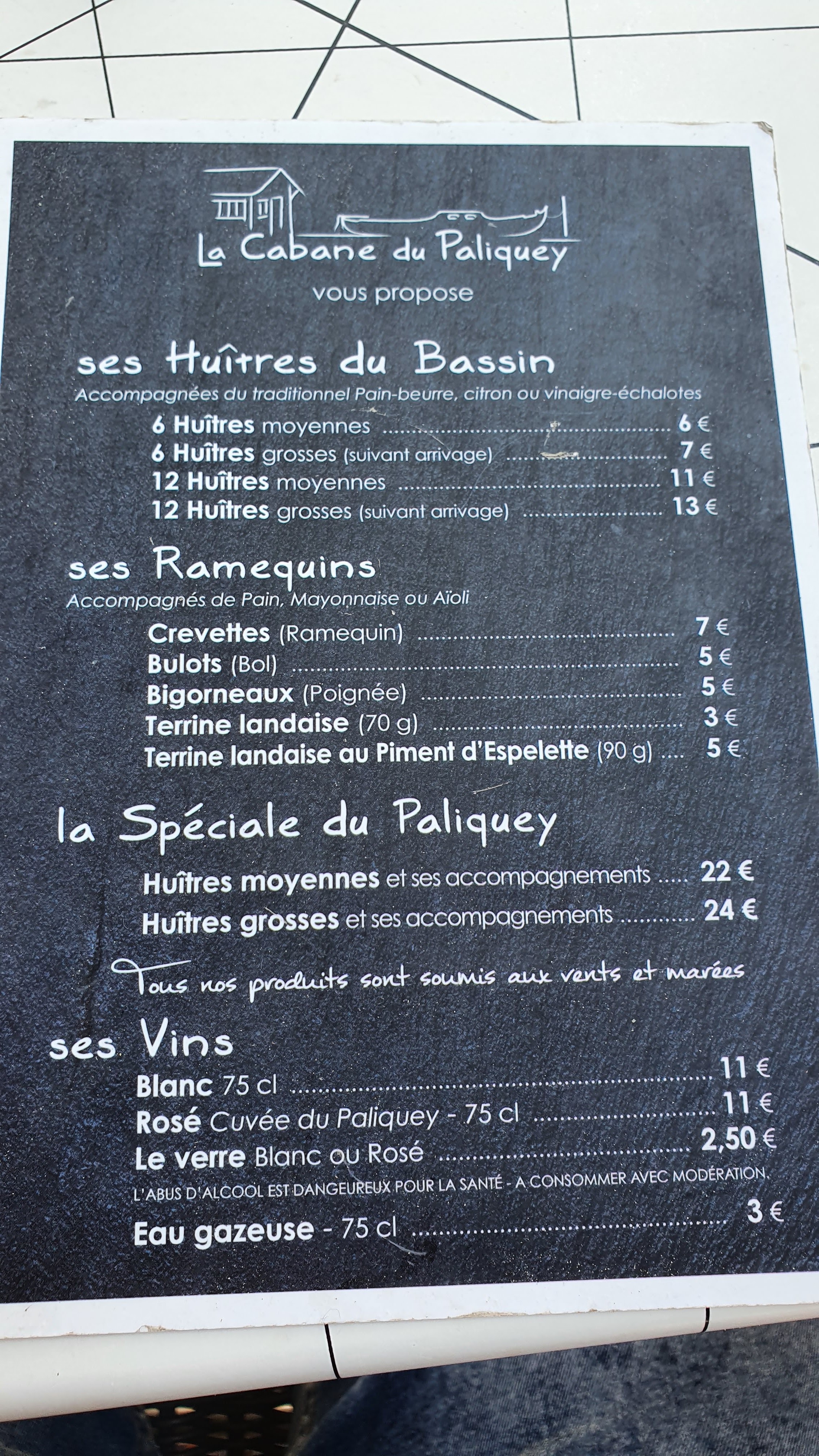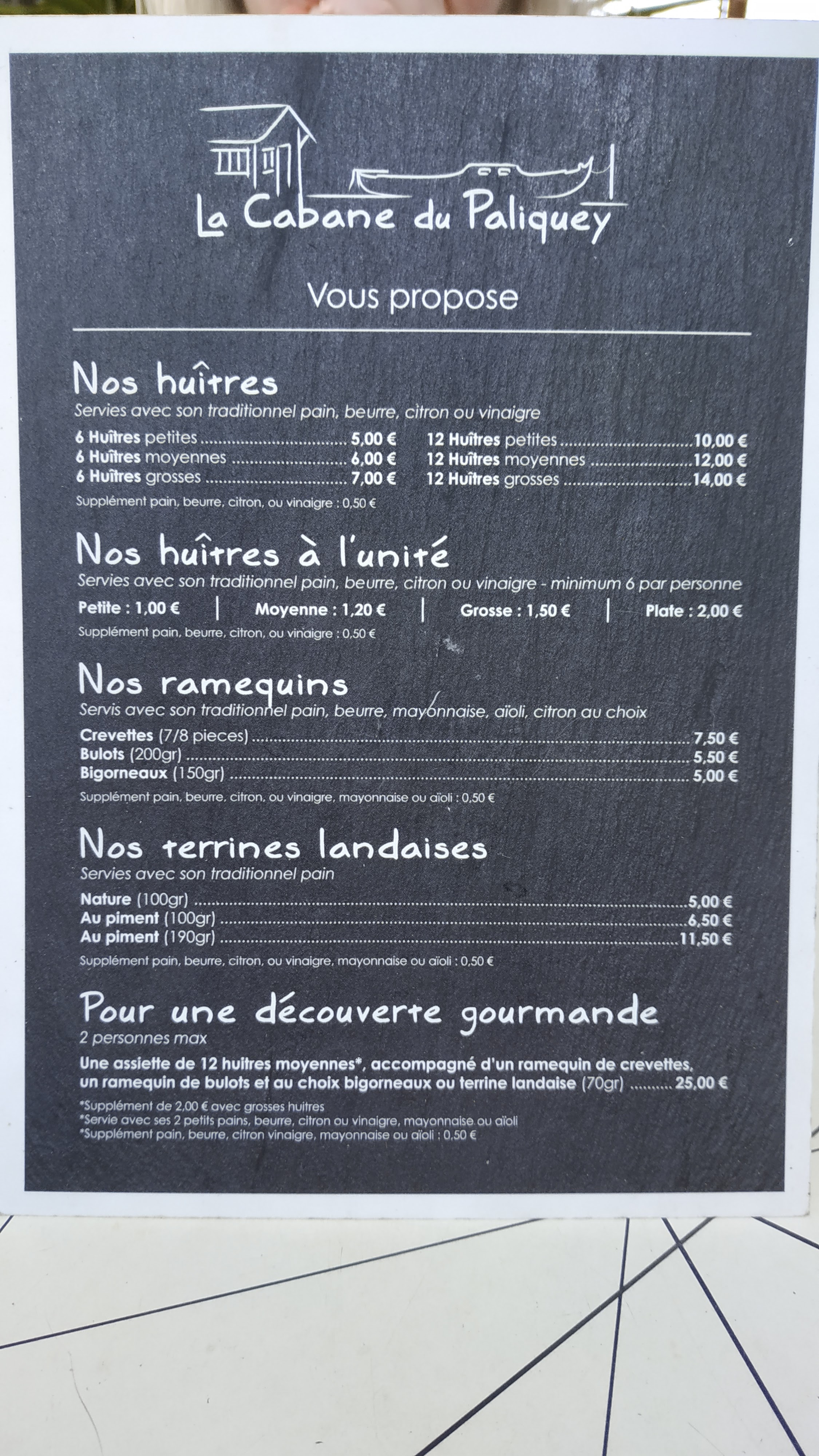 Posté le 11/07/2019 à 15:38"Guidée par les avis positifs et pas déçu Un dimanche soir à 20h30 alors que les dégustations en cours depuis la fin de matinée. Du personnel agréable gentil et efficace. Formule à 22euros par personne comprenant 12huitres avec beurre et citron bol crevettes roses taille moyenne bol bulots bol bigorneaux et terrine landaise Le blanc pas mal non plus A recommander"