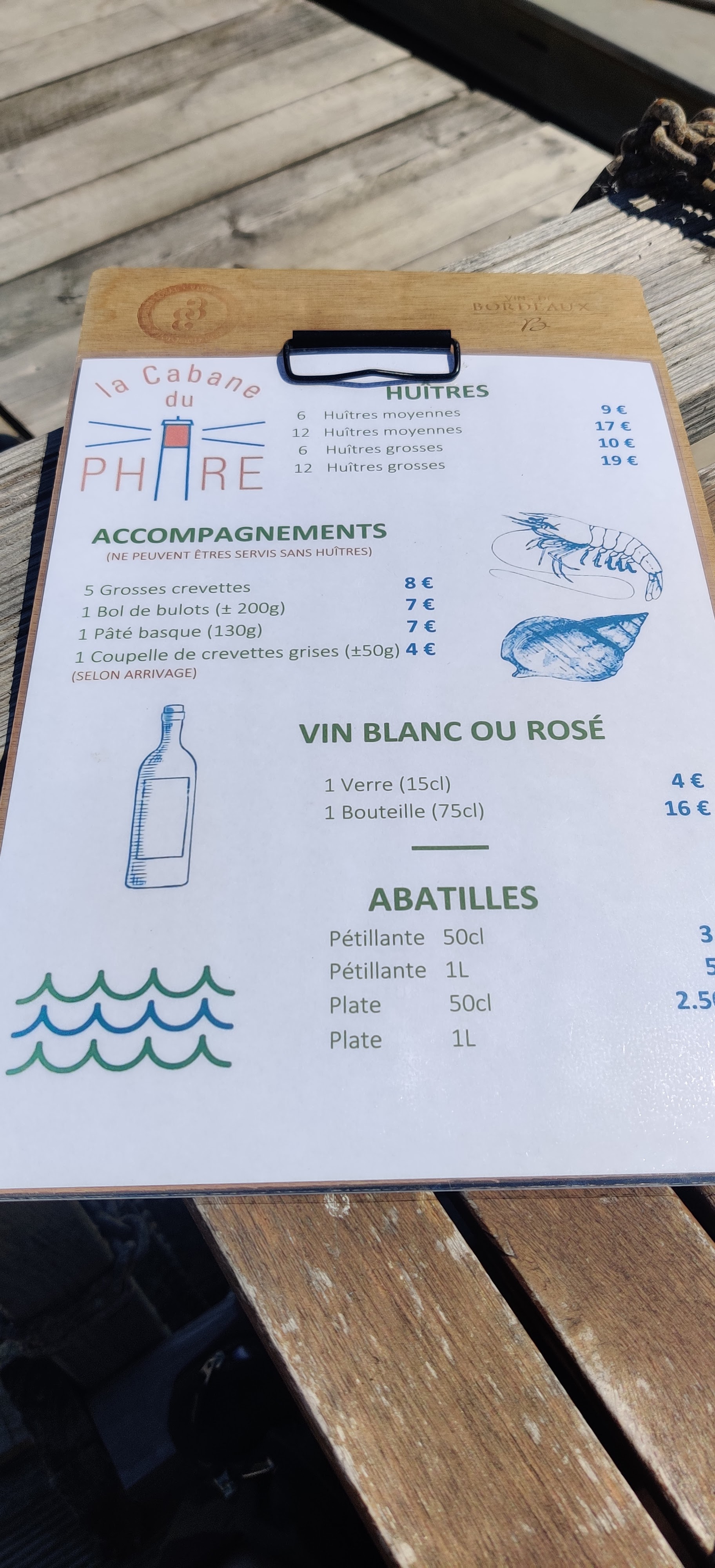 Posté le 16/08/2018 à 18:38"Sur le retour de la plage, après une balade au phare, nous avons découvert par hasard la cabane du phare. Nous nous sommes régalés avec huîtres, crevettes, bulots, pâté et verres de vin bien sûr pour un montant très raisonnable à 3 (40€). Accueil et service très sympathique, notre enfant de 4ans1/2 a pu jouer les pieds dans le sable, aller sur le ponton et autour du bassin sans que cela ne gêne. Nous avons pu discuter à la fin du repas avec le patron et le personnel, un moment d'échange & de partage authentique. Bref, une soirée très agréable que nous n'oublierons pas, nous reviendrons c'est sûr !"
