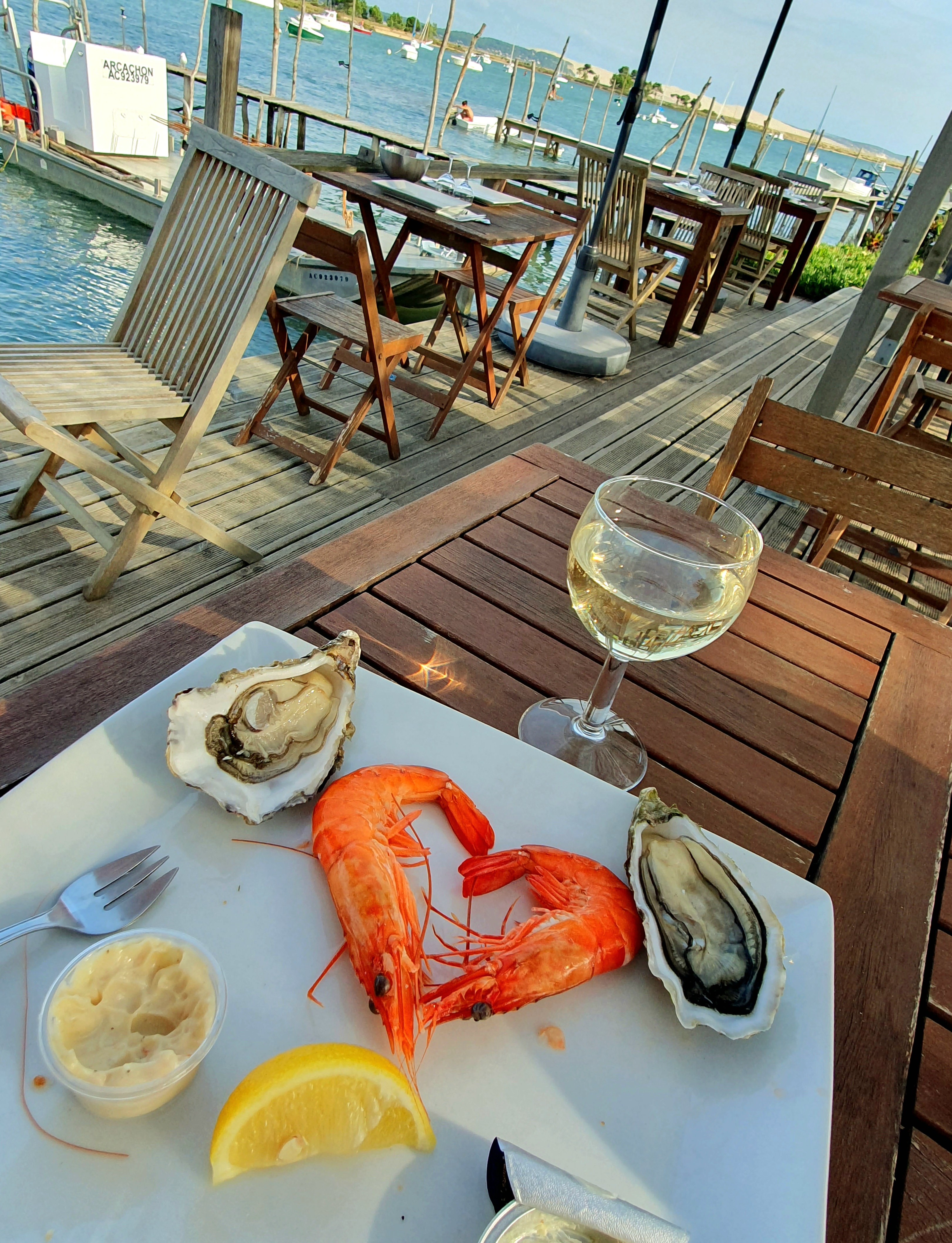 Plateaux de fruits de mer, face au bassin, et pas très chers. Je recommande.