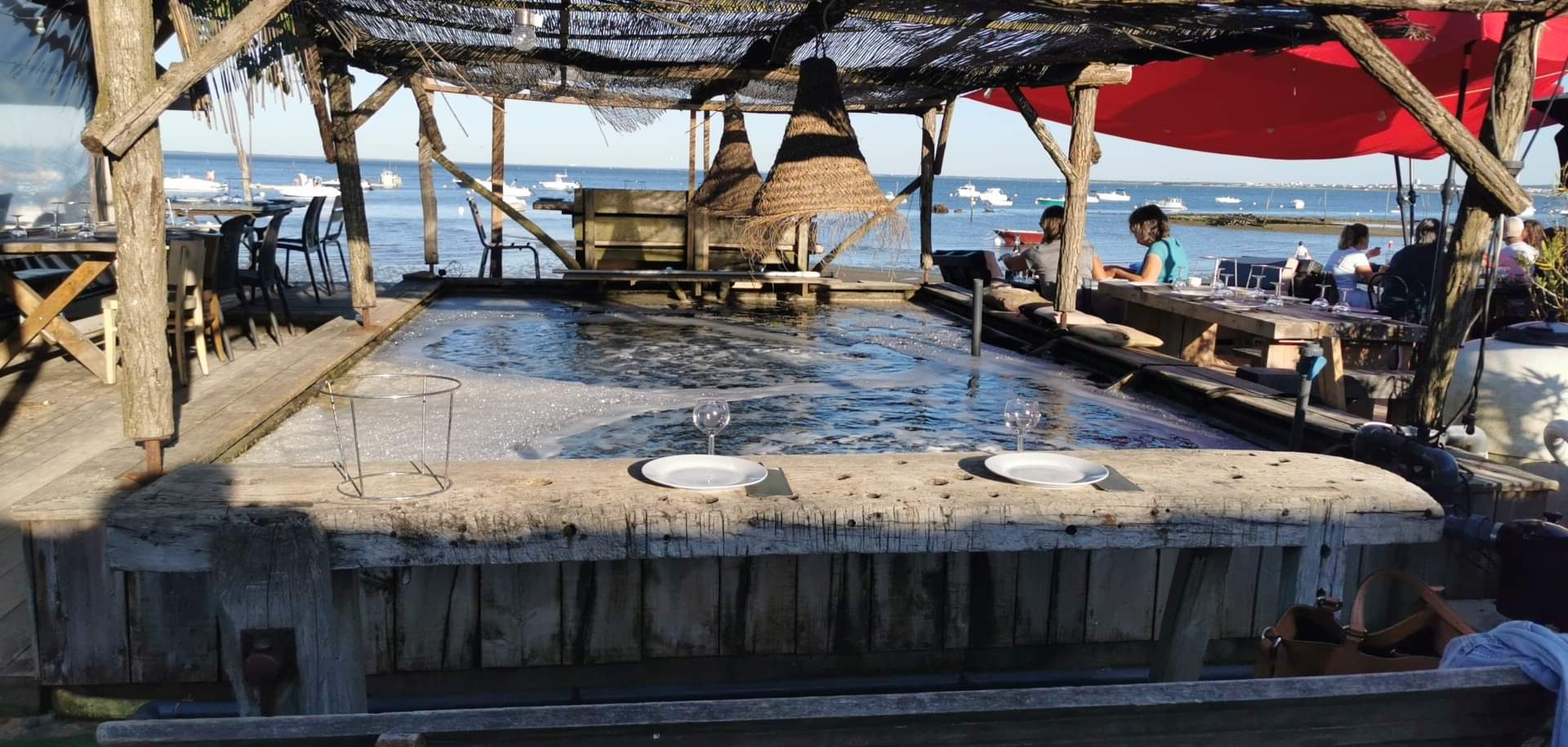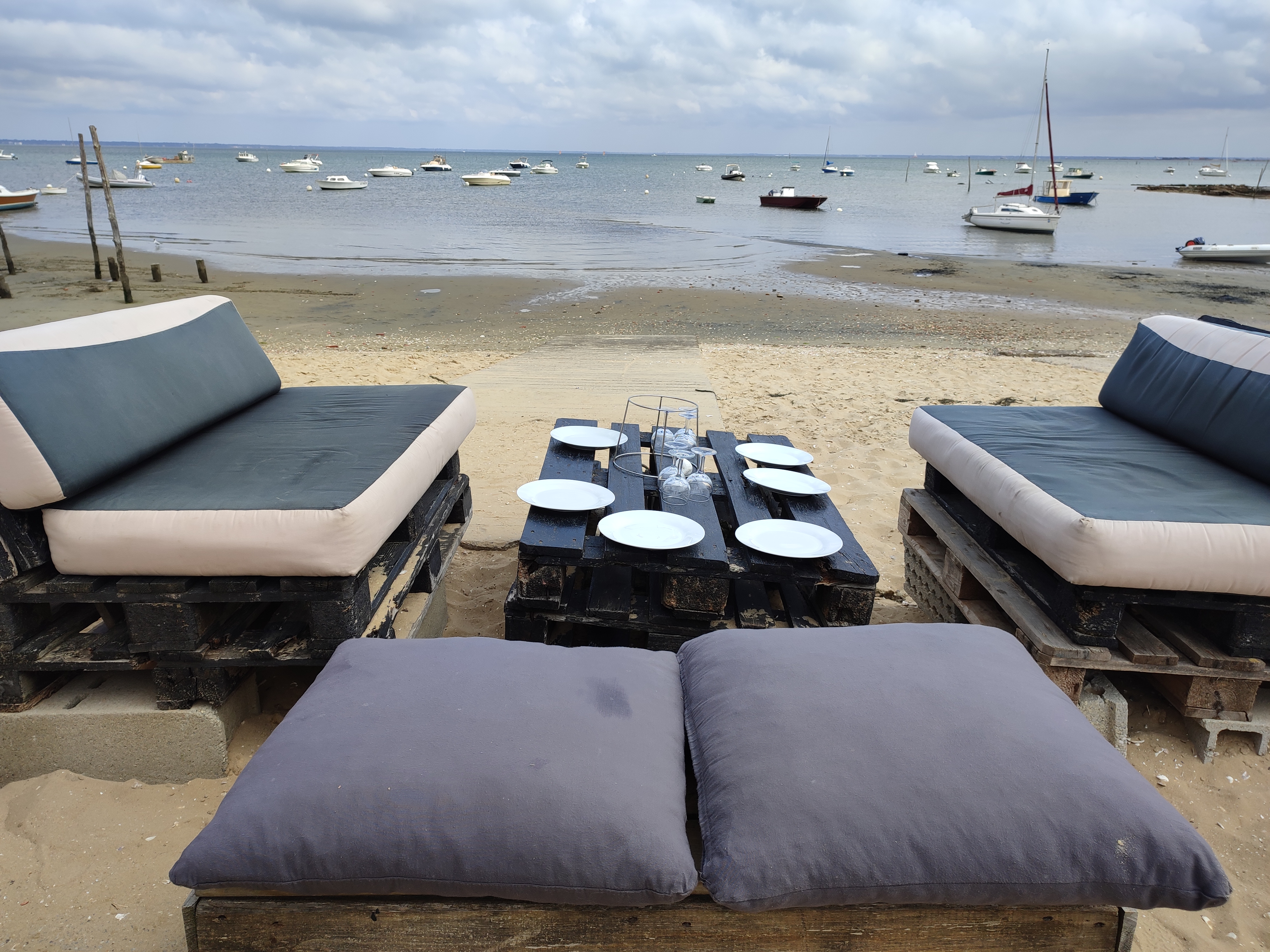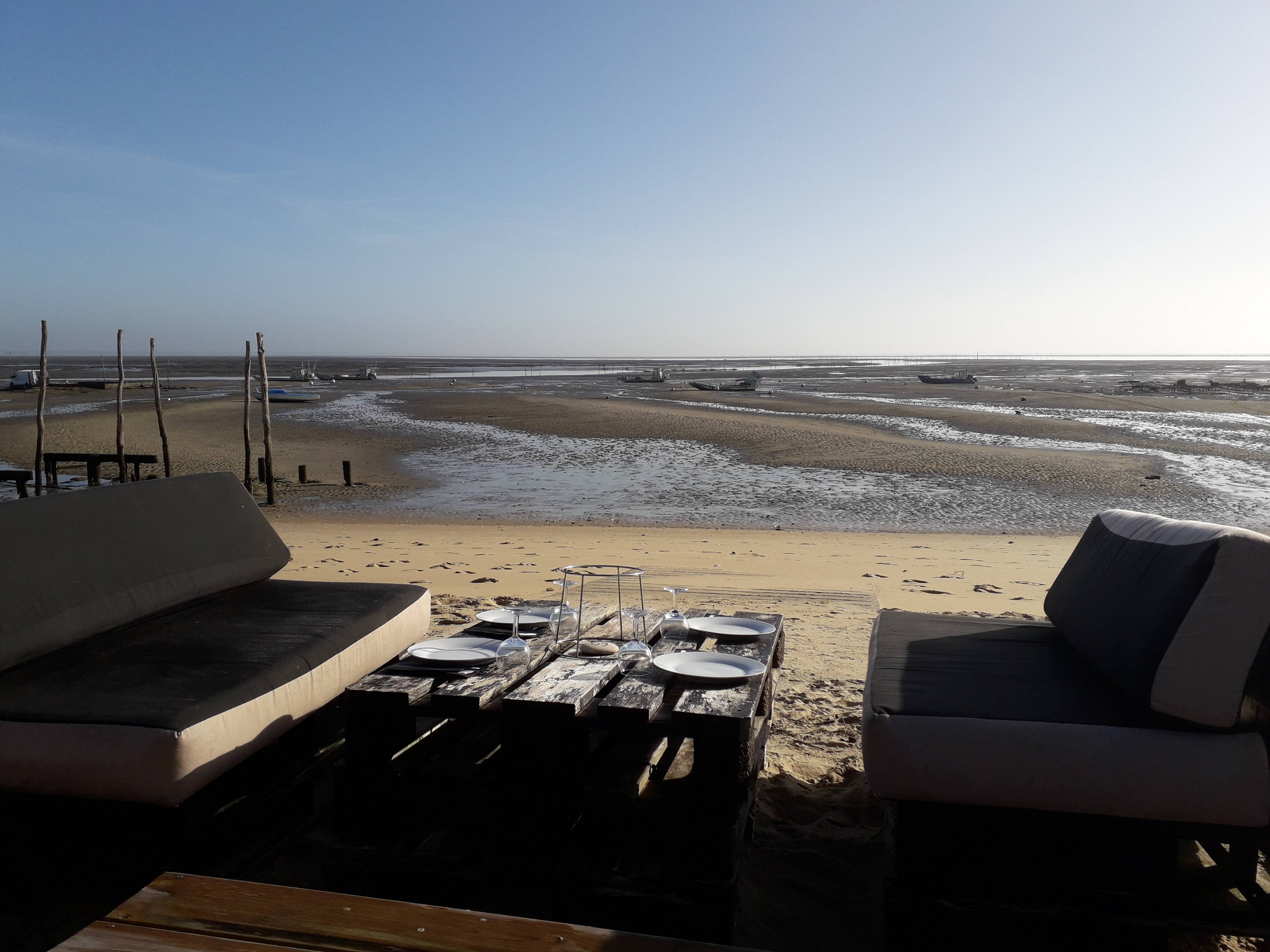 Posté le 14/06/2023 à 09:25"Les pieds dans le sable . Table mi ombragée. Au bord de l eau 18H mis en bouche avec des huîtres du bassin. Sympa à faire pour le plaisir.."