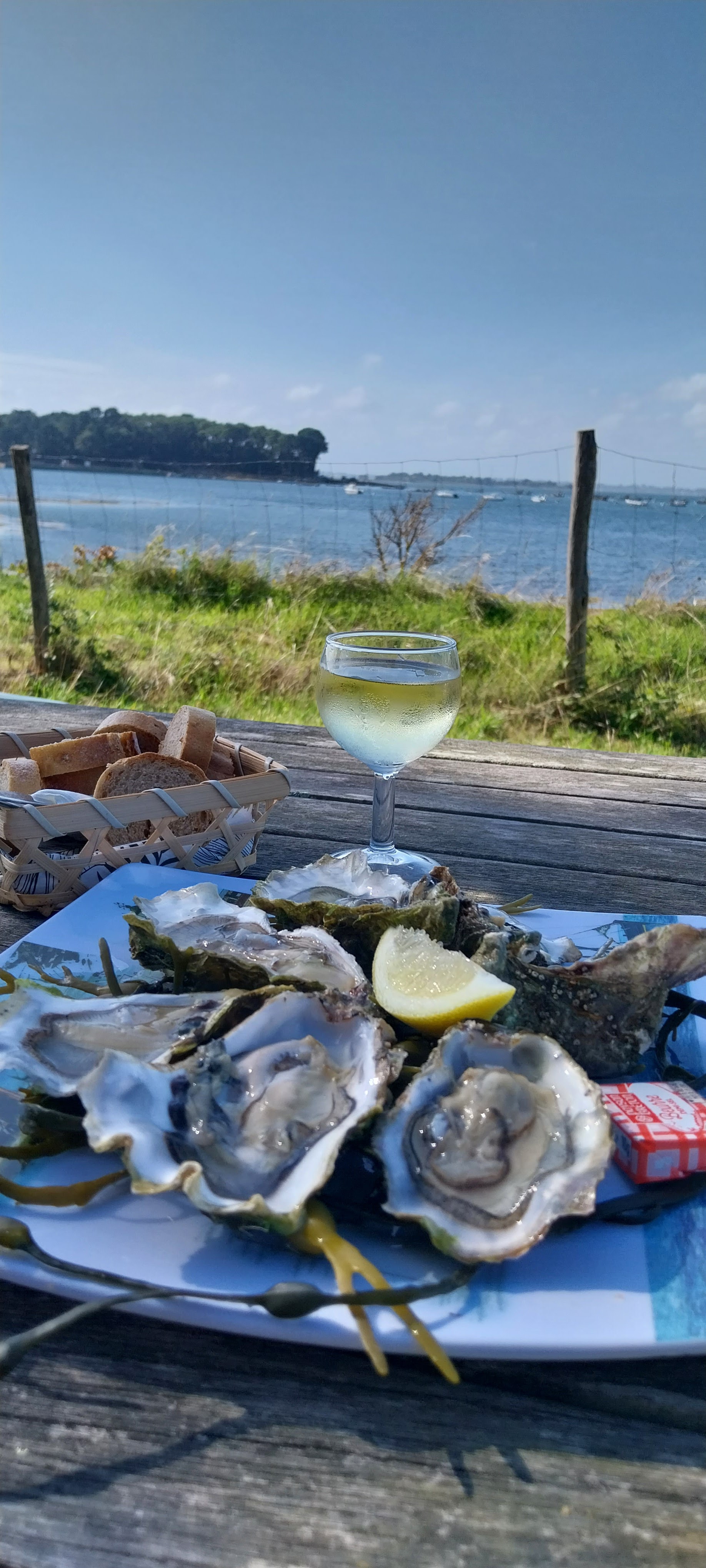 Belle expérience sur une pointe de terre face au golfe du Morbihan, vue magnifique (même à marée basse) lieu chaleureux et accueillant, super pour une pause au calme, loin de tout. Les assiettes apéros sont sympathiques, les huîtres fraîches et bonnes. Le verre de vin blanc inclus est un vrai plus. Hôtes charmants, zen et sympas, ça change des accueils parfois distants et blasés des commerces/restaurants aux alentours.