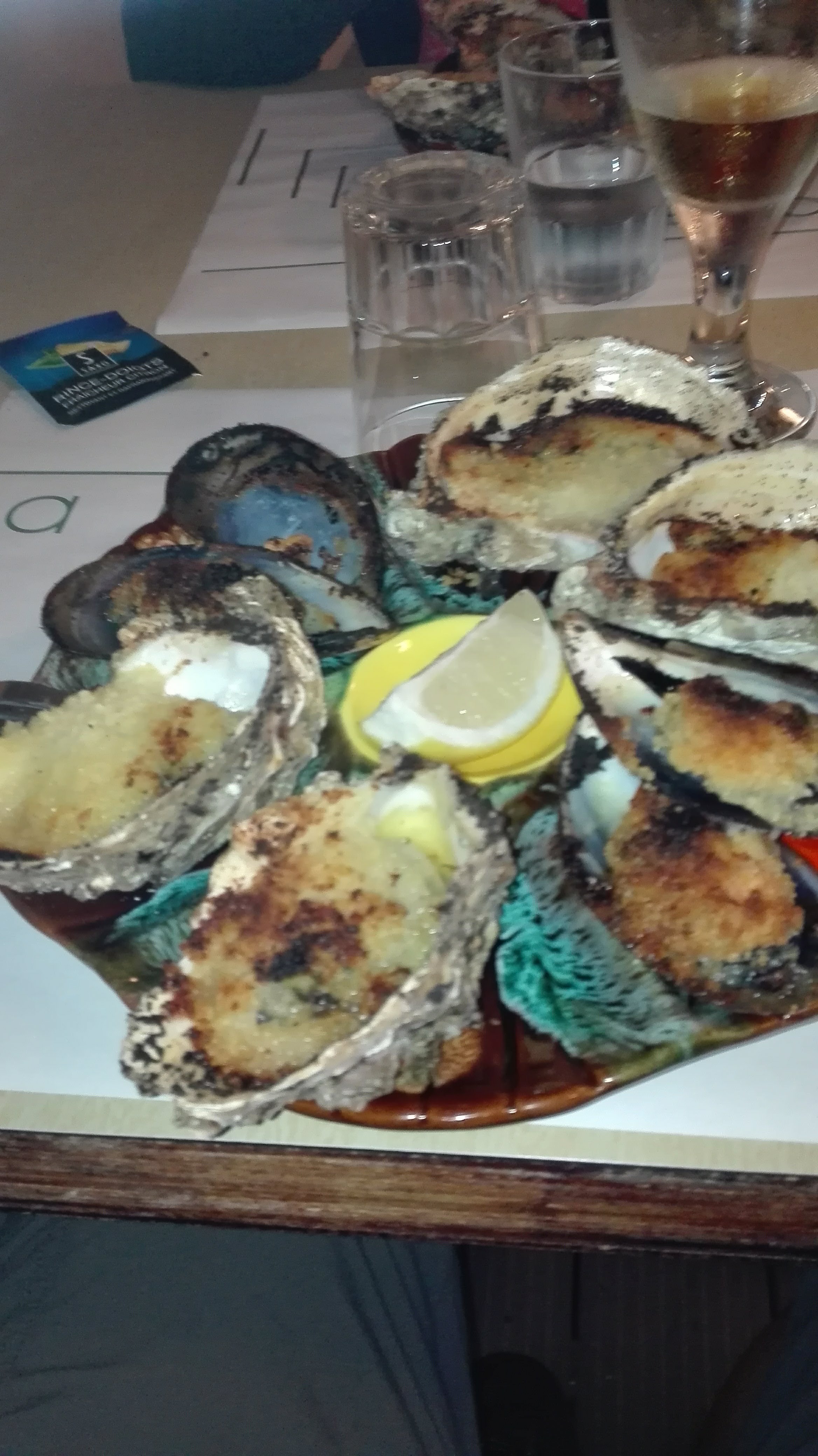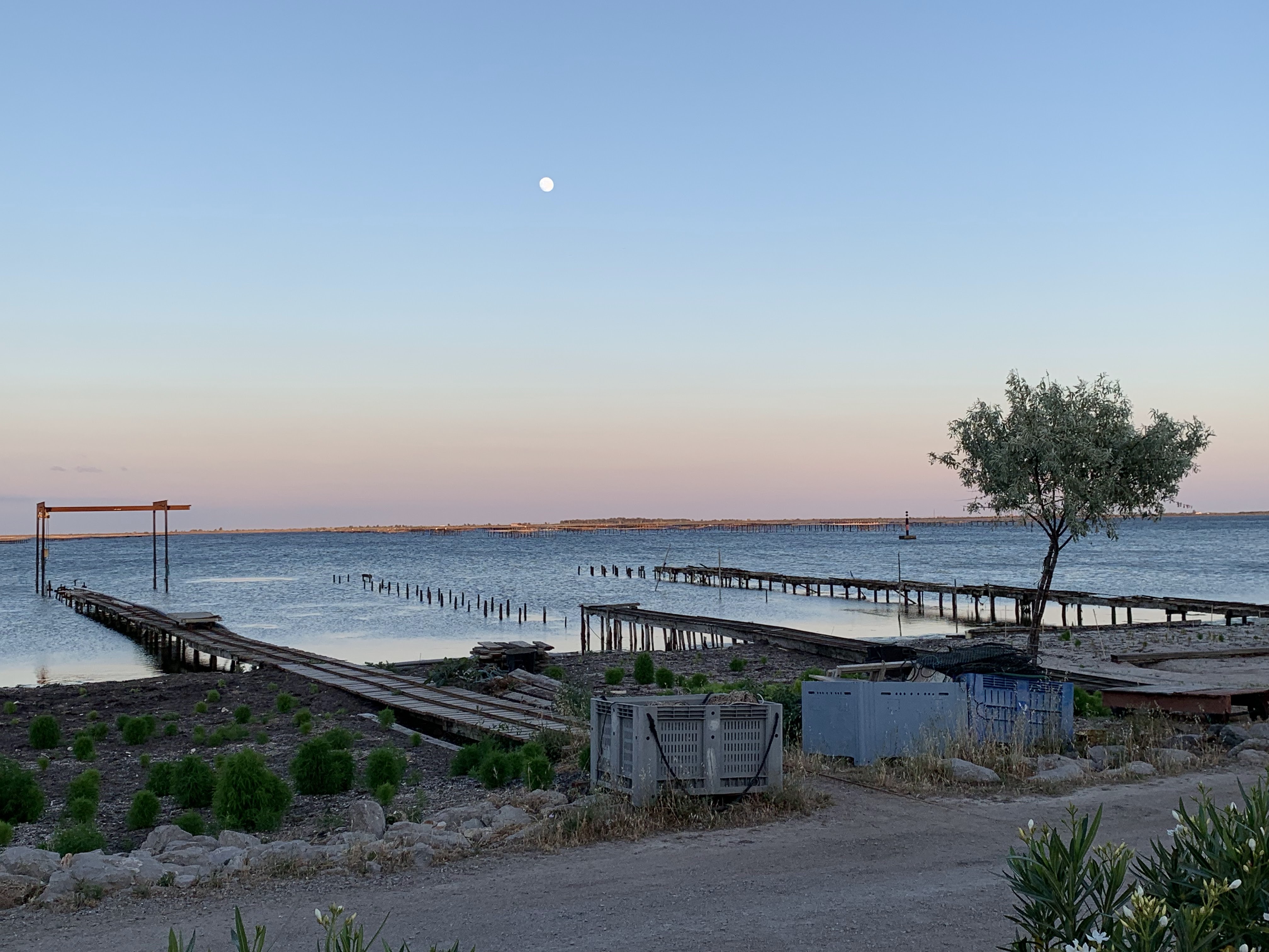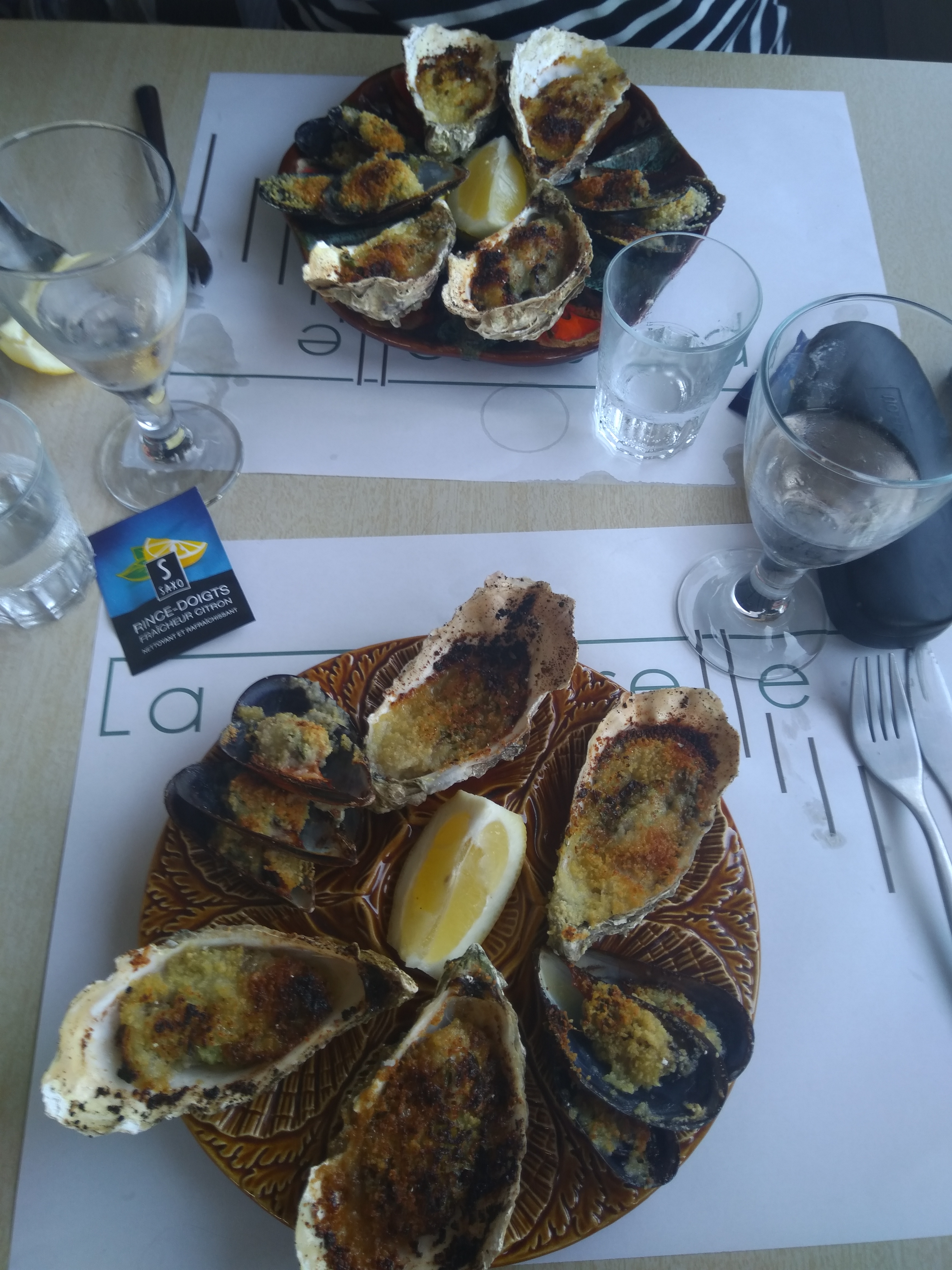 Un régal : huîtres de l’étang de Thau, moules idem gratinées comme nulle part ailleurs et pour conclure un pot de glace local avec une vingtaine de parfums au choix Waouhhh !!!! On y retourne demain! Et le paysage est sublimé par ce bel étang de Thau