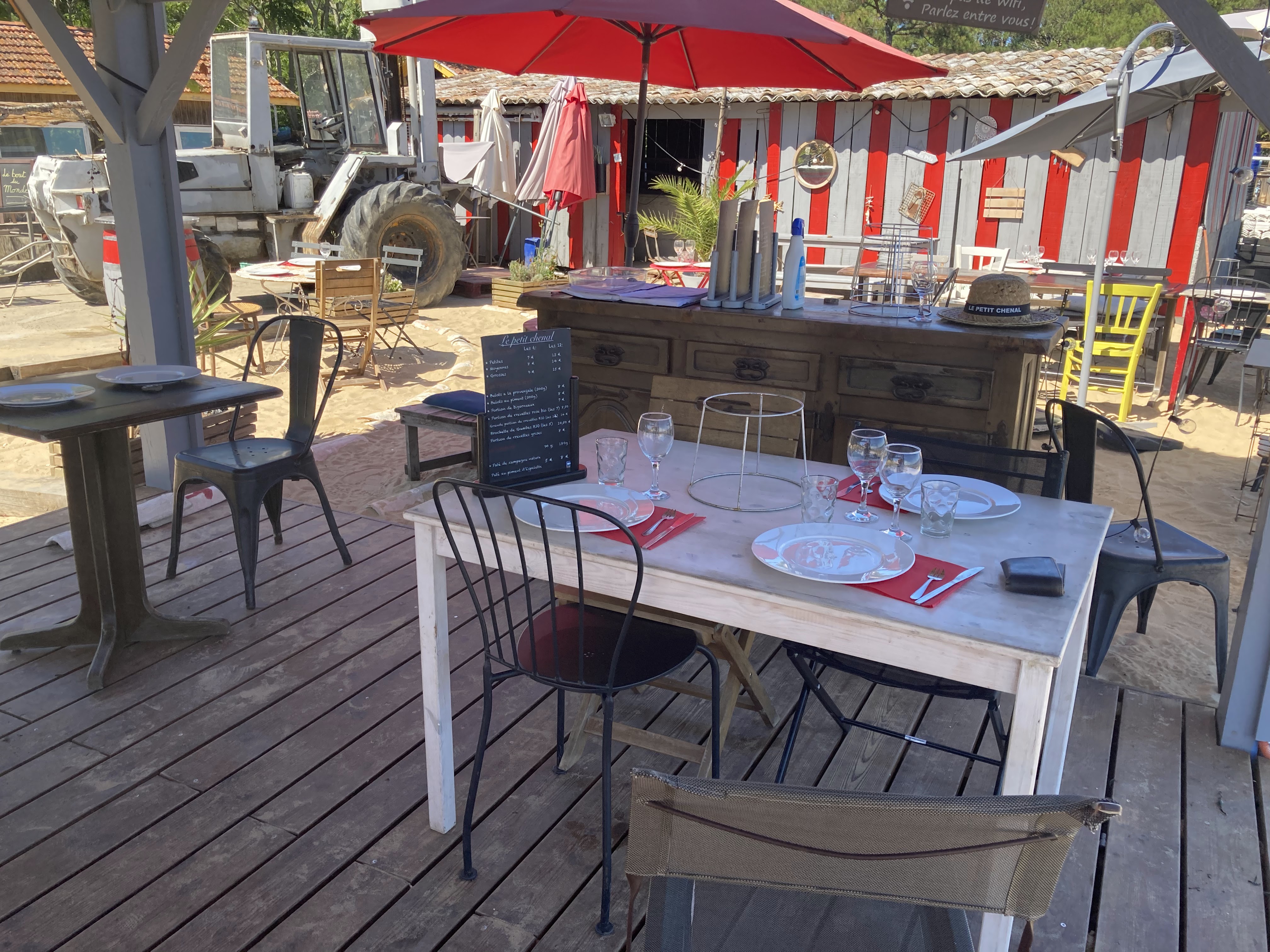Lieu où déguster des huîtres fraîches les pieds dans le sable ou non, au choix. La décorations avec vieilles tables et chaises différentes m'a beaucoup plu. Belle découverte.