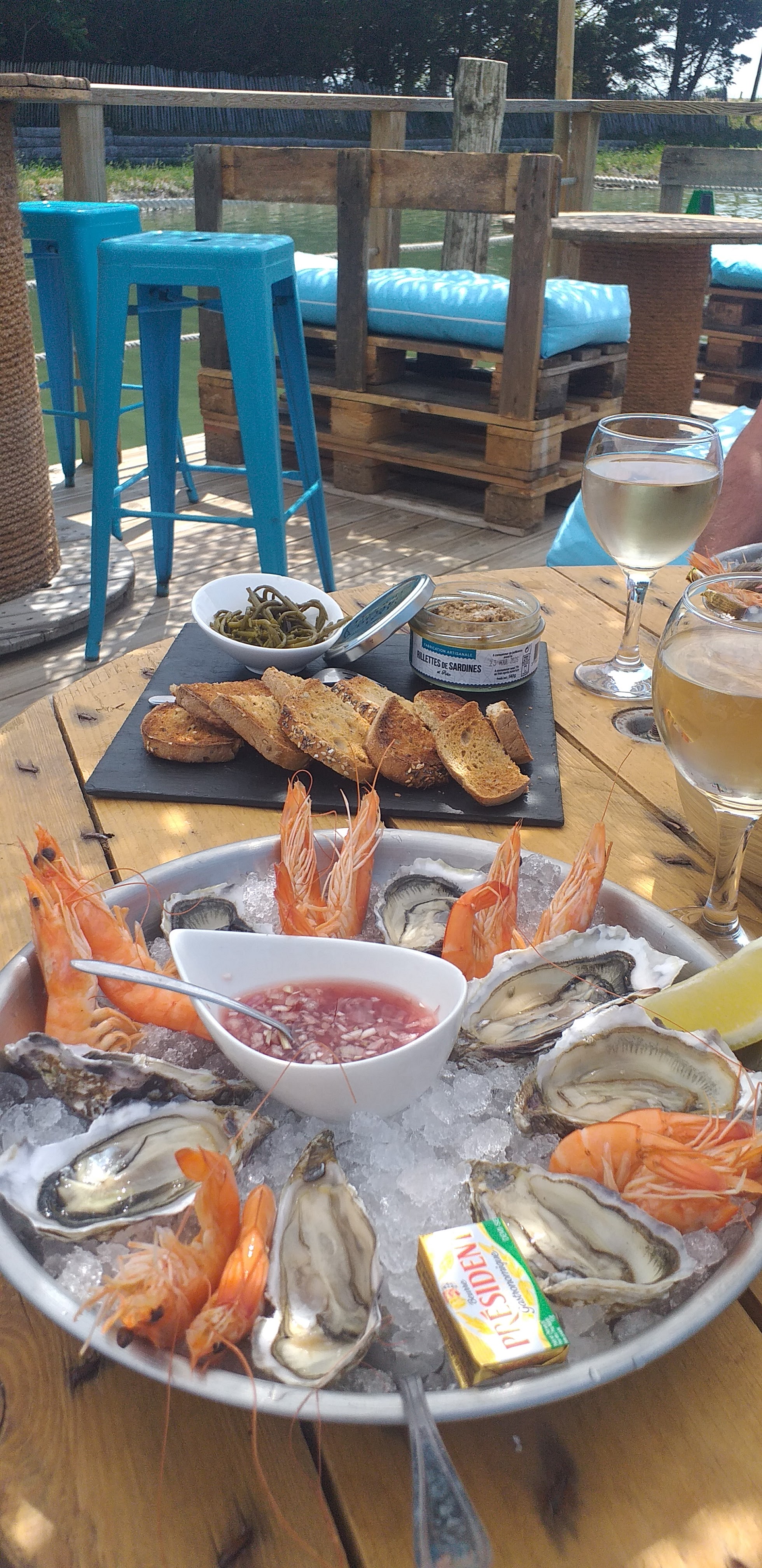 Lieu paisible, conviviale, confidentiel. Plats ultra frais, huitres, palourdes, crevettes, planche duo avec thon et saumon fumé et toats de rillettes de sardines. Moment très sympathique !