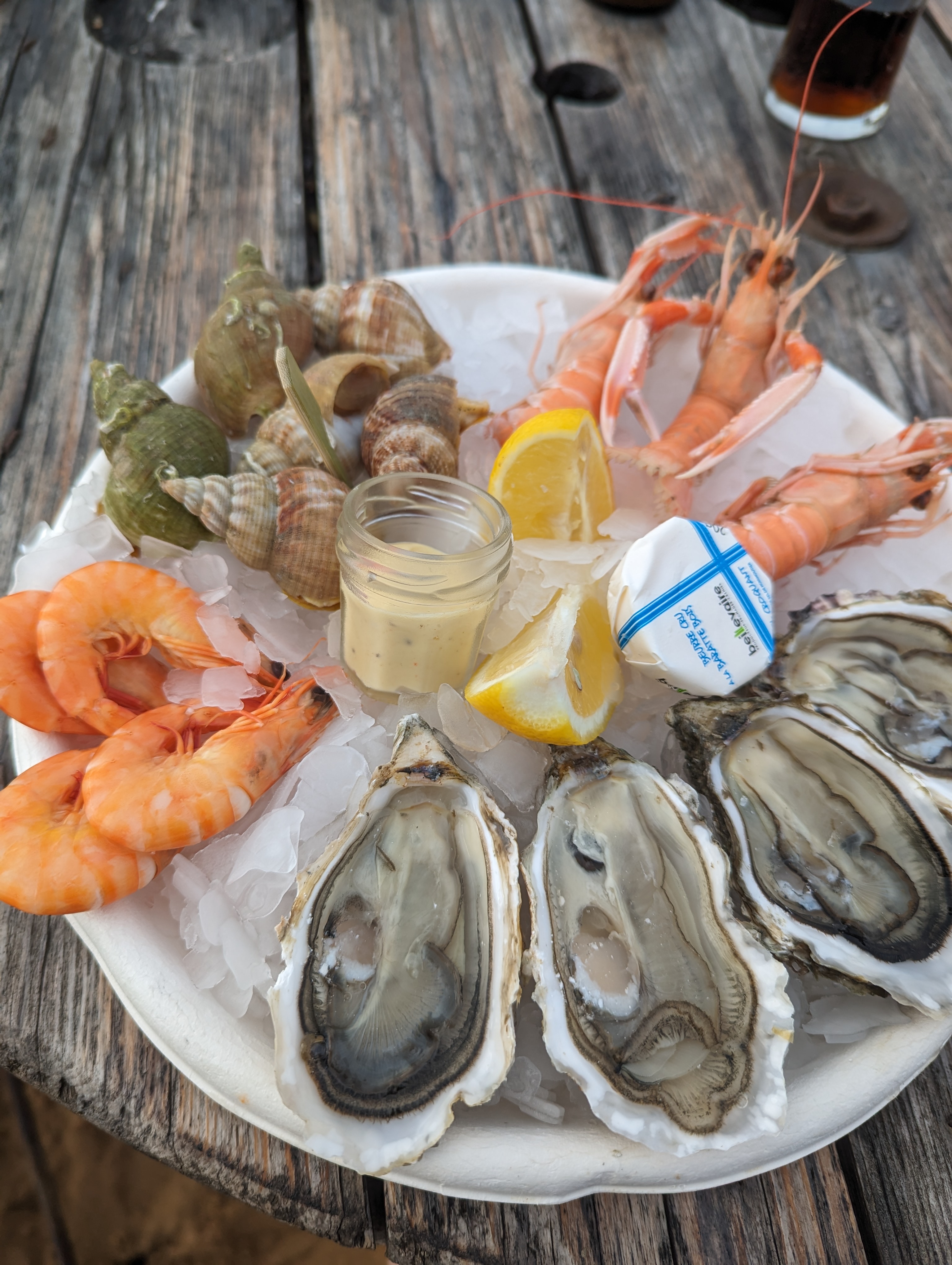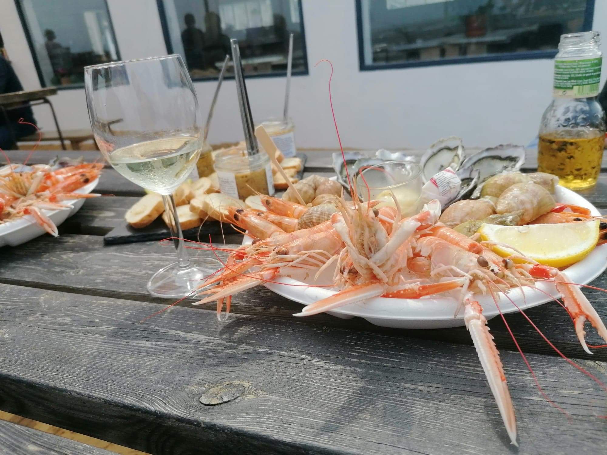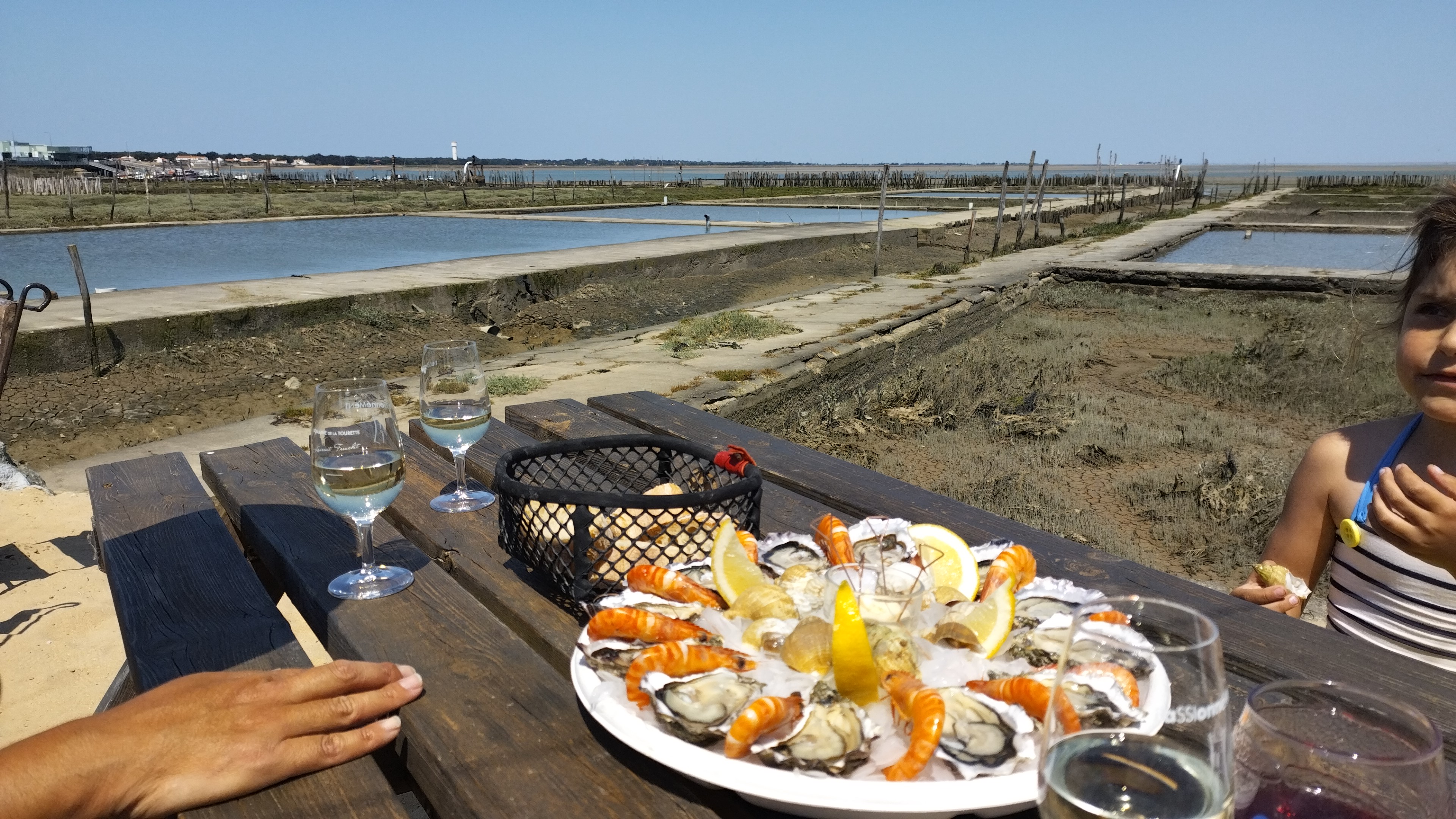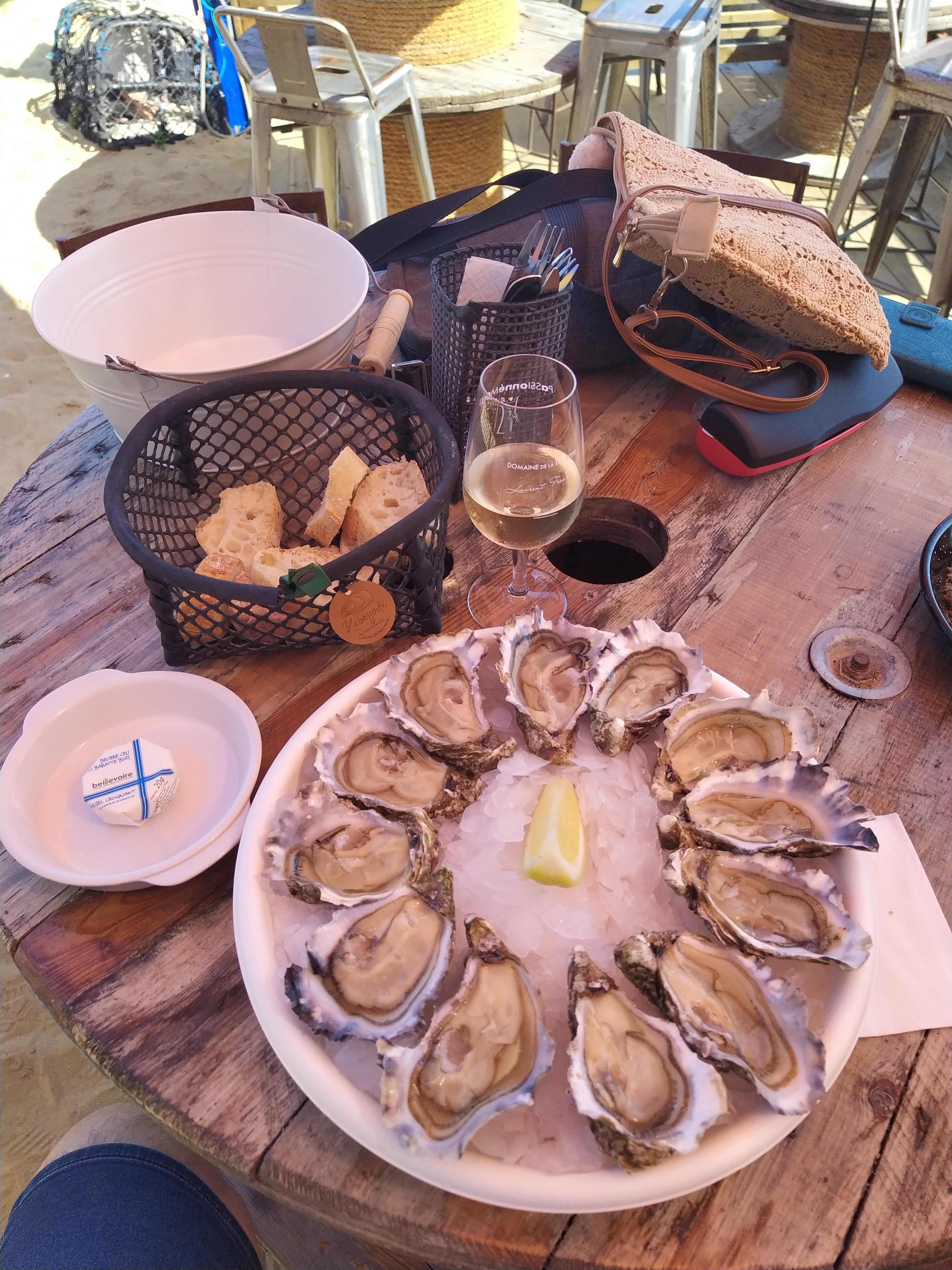 Nous ne pouvions pas partir de notre lieux de vacances sans faire un bar à huîtres … choisi un peu au hasard .. c’était impeccable bonne huîtres crevettes bulot et langoustines … au top avec un verre de muscadet .. on était bien au bord de l’eau dans une deco récup les pieds dans le sables … super sympa ! Merci à l’équipe